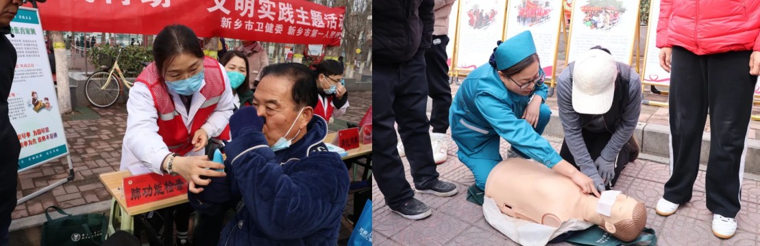 前來(lái)咨詢和就診的群眾絡(luò)繹不絕,尤其是肺功能檢查受到特別青睞,呼吸與危重癥醫(yī)學(xué)科一病區(qū)董林穎老師耐心指導(dǎo)群眾進(jìn)行肺通氣功能檢測(cè),深入淺出地給與日常保健的專業(yè)指導(dǎo)。醫(yī)護(hù)人員還通過(guò)發(fā)放宣傳資料等方式,把健康送到群眾身邊,讓優(yōu)質(zhì)醫(yī)療服務(wù)觸手可及。急診醫(yī)學(xué)科馬明丹老師為群眾培訓(xùn)心肺復(fù)蘇術(shù),現(xiàn)場(chǎng)演示吸引了許多市民駐足學(xué)習(xí),“一對(duì)一”、“手把手”給予指導(dǎo),規(guī)范急救動(dòng)作,確保市民掌握標(biāo)準(zhǔn)的急救技術(shù)。
