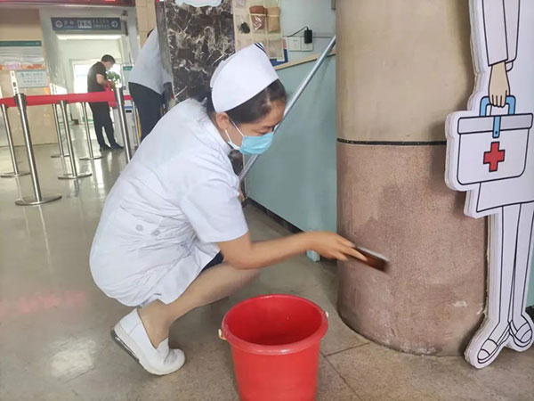 藥房、收費、采血、物業(yè)等各科室部門,一呼百應、積極行動。所有診室、大廳、休息室、衛(wèi)生間,從天花板到地面,“海、陸、空”,不放過任何一個角落,徹徹底底地進行地毯式清潔。